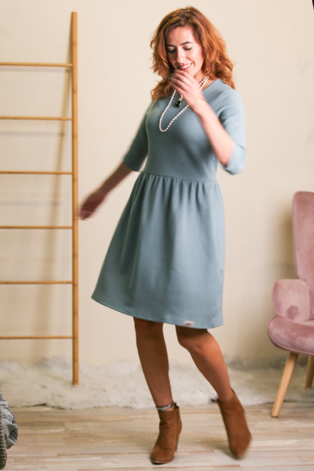 - s půlením cca v pase, elegantním řasením a příjemným kulatým výstřihem
