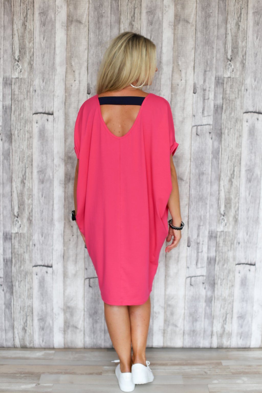 Tahle tunika se dá nosit jako tunika k legínám anebo jako šaty - a klidně i naboso. V MeeraDesign jí familiérně říkáme pytel, a když nad tím teď tak přemýšlím, říkám si, že je skvělé, že si můžeme všechny vyzkoušet, že nám sluší opravdu i ten pytel :-). Ale vážně - tunika má jednoduchý volný střih a hlubší výstřih se stuhou na zádech (zajímavý prvek v navy barvě) a nemá kapsy. Úplně nějskvělejší je na naše oblíbená horká léta, protože se v ní potíte úplně minimálně. A díky délce mírně nad kolena ji směle můžete nosit naboso. No.. a taky v ní schováte všechno co nechcete ukazovat a zvýrazňovat :-).